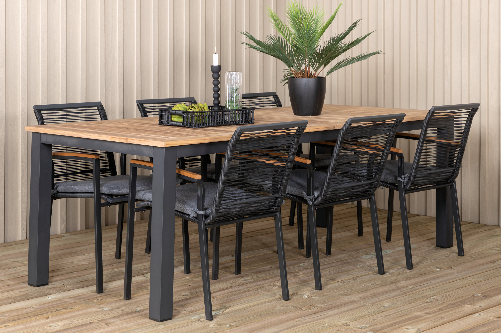 Panama är ett praktiskt och stilrent matbord som enkelt kan förlängas vid behov. Den robusta bordsskivan i teak ger en naturlig och inbjudande känsla, medan den stabila aluminiumstommen gör bordet både hållbart och väderbeständigt. Tillsammans med 6st bekväma och stapelbara Dallas matstolar i svart skapas en funktionell och modern matgrupp. Stolarna har sits och rygg i slitstarkt polyester och är utrustade med mjuka dynor för extra komfort. Perfekt för långa middagar utomhus.