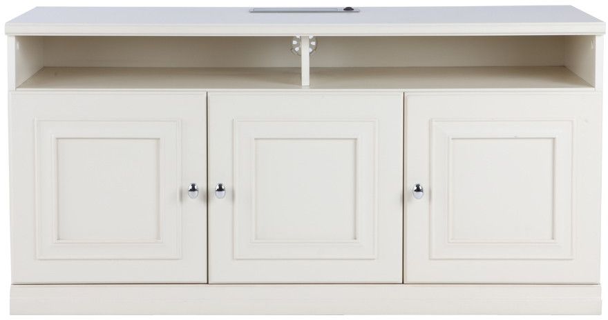 En lantlig vitmålad TV-bänk med fina och arbetade detaljer. Med sin finish av PVC blir den både värme- och fukttålig. Mediabänken har stora förvaringsmöjligheter med tre skåp och två fack ovanför. De förberedda hålen både uppe på och baktill kan du på ett snyggt sätt dölja och hålla ordning på dina kablar.