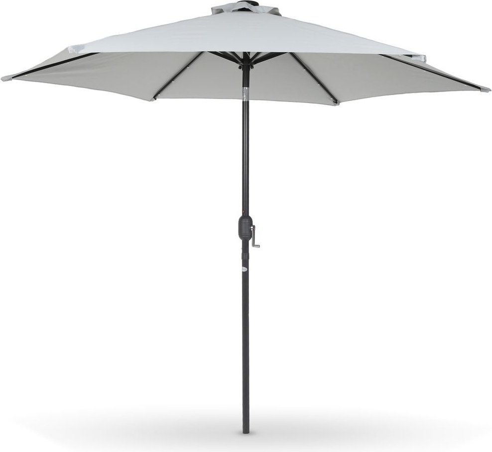 Smidigt och lätt hanterbart parasoll med inbyggd LED belysning som drivs av solcell i toppen av parasollet. Lätt att fälla upp och ihop med veven i mitten av stolpen. Stolpen är tillverkad av pulverlackerad stål och solskyddet är av polyester.