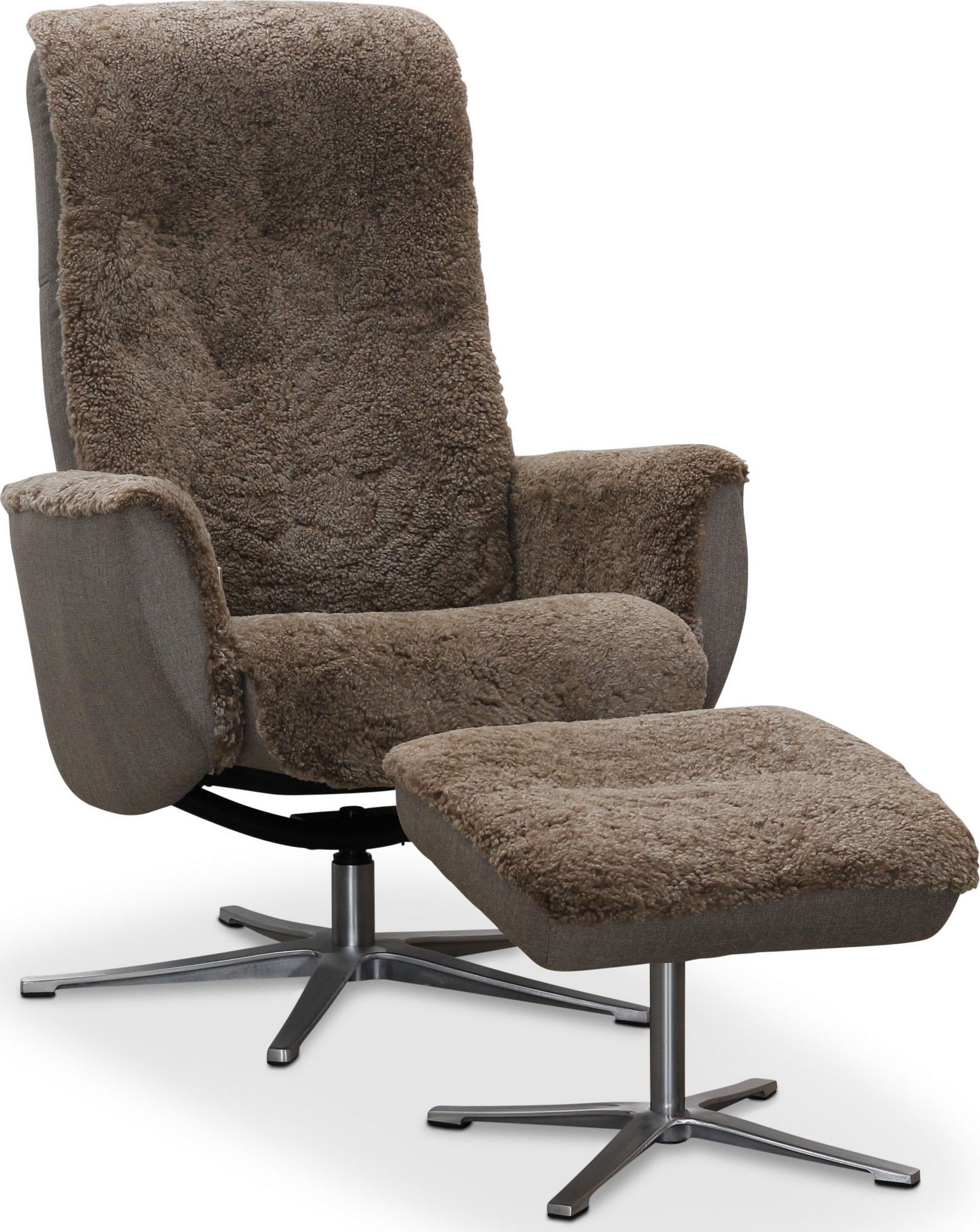 Snurrfåtölj i fårskinn med fällbart ryggstöd som formas efter rygg och nacke när det fälls bakåt. Fotpall och löstagbara armstödsskydd ingår. Finns även i tyg och läder.