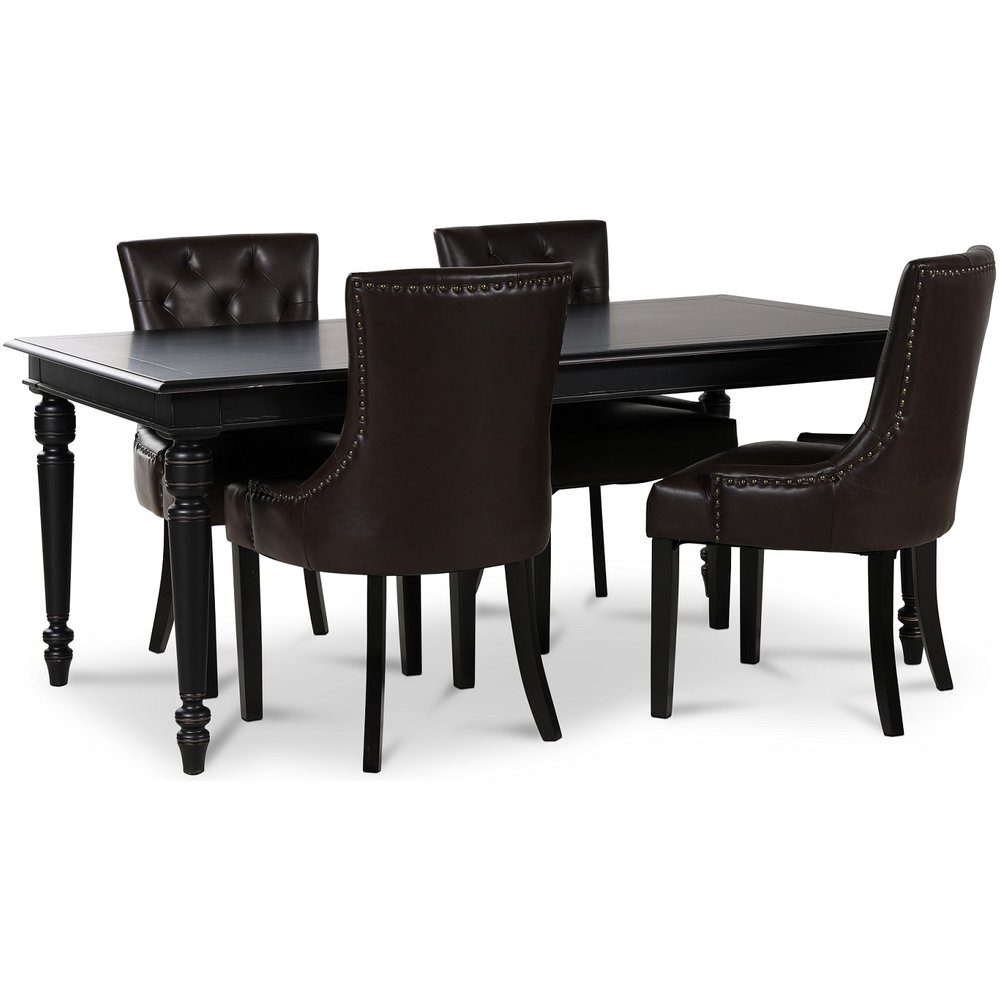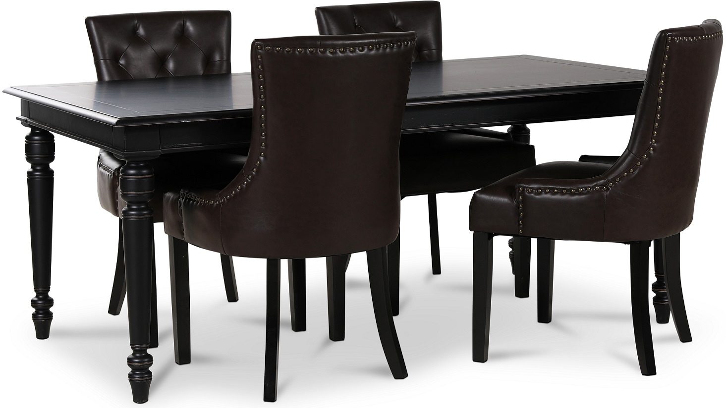 Matgrupp från Skånska Möbelhuset, Paris är ett klassiskt matbord i svartlackat massivt trä med arbetade och välplanerade detaljer. Fyra stycken moderna och matchande Tuva Eastport stolar i brunt PU med antikfärgade nitar.