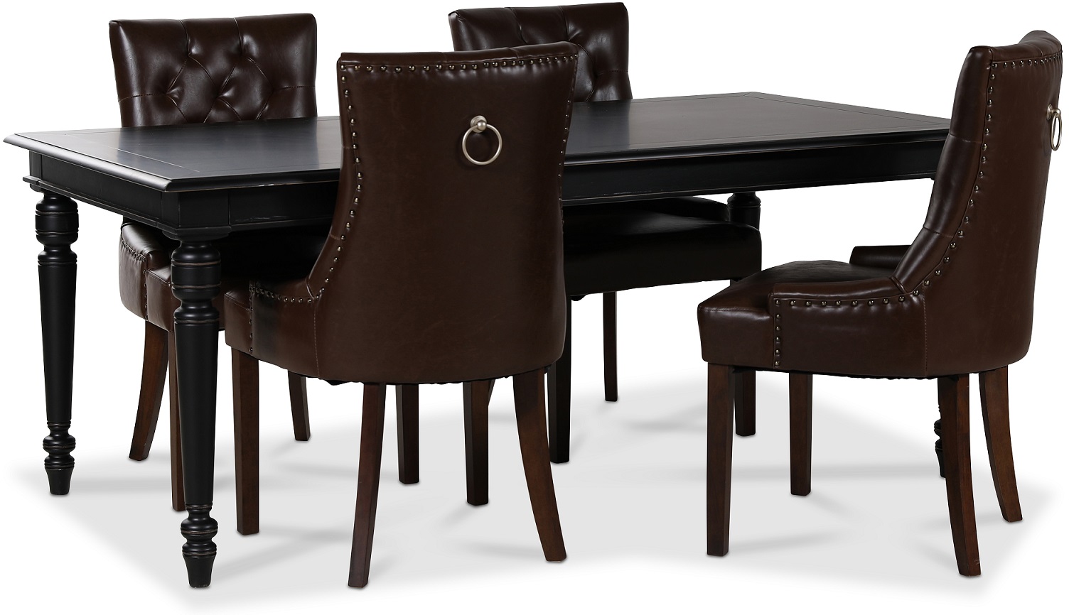 Matgrupp från Skånska Möbelhuset, Paris är ett klassiskt matbord i svartlackat massivt trä med arbetade och välplanerade detaljer. Fyra stycken moderna och matchande Tuva stolar i brunt PU med rygghandtag och nitar i antikutförande.