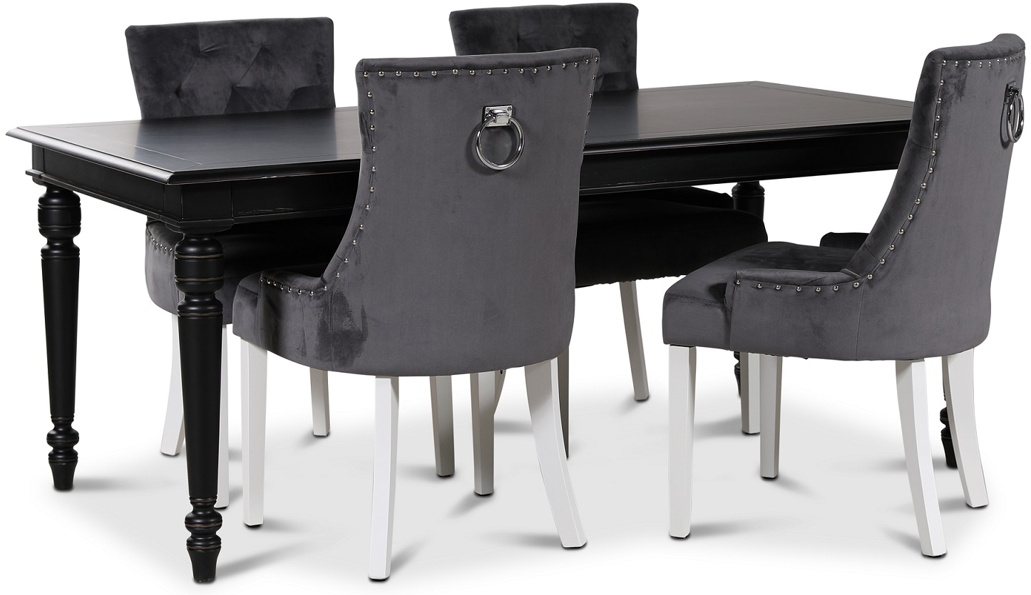 Matgrupp från Skånska Möbelhuset, Paris är ett klassiskt matbord i svartlackat massivt trä med arbetade och välplanerade detaljer. Fyra stycken moderna och matchande Tuva stolar i grått sammets tyg med kromade nitar, rygghandtag och vita ben.
