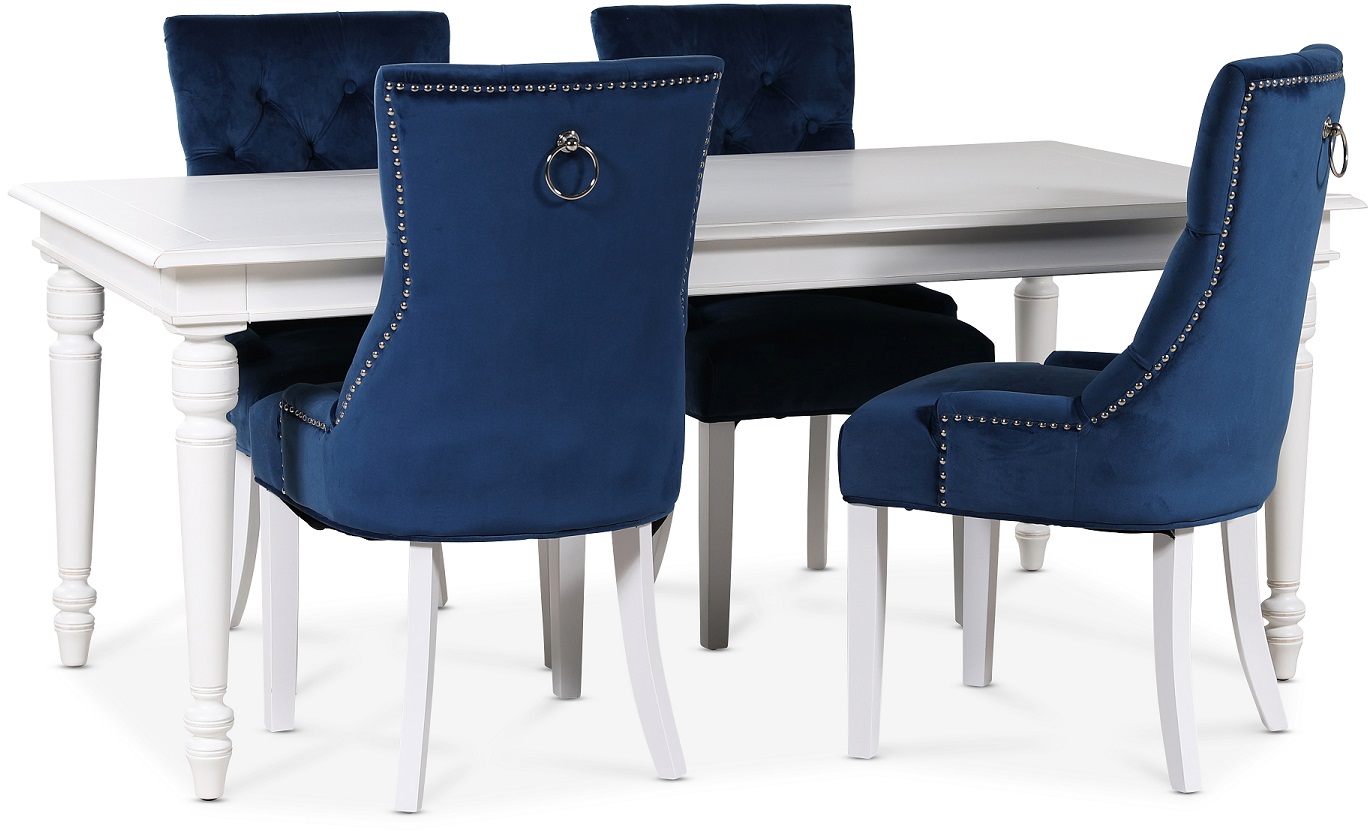 Matgrupp från Skånska Möbelhuset, Paris är ett klassiskt matbord i vitlackat massivt trä med arbetade och välplanerade detaljer. Fyra stycken moderna och matchande Tuva Decotique stolar i blått sammet med rygghandtag och vita ben.