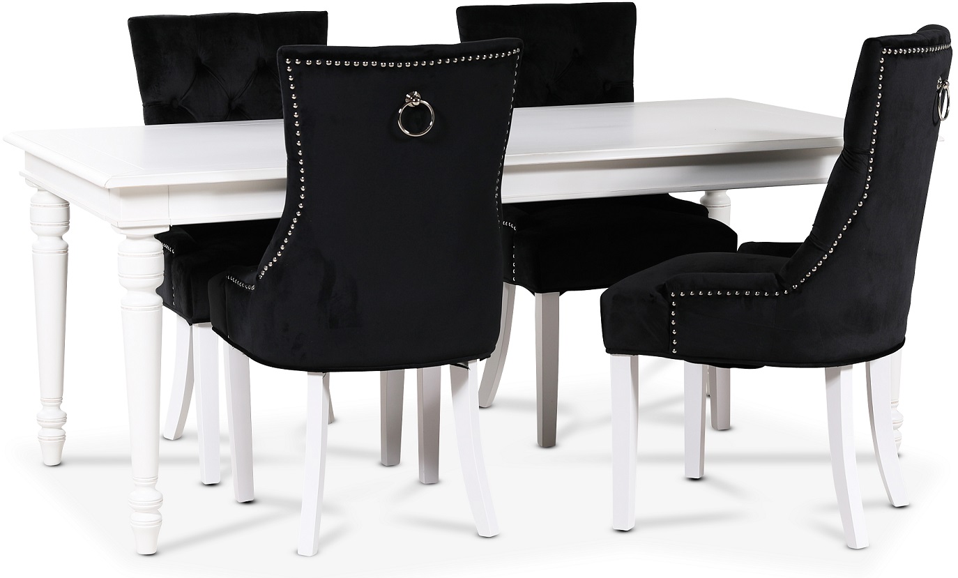 Matgrupp från Skånska Möbelhuset, Paris är ett klassiskt matbord i vitlackat massivt trä med arbetade och välplanerade detaljer. Fyra stycken moderna och matchande Tuva Decotique stolar i svart sammet med rygghandtag och vita ben.