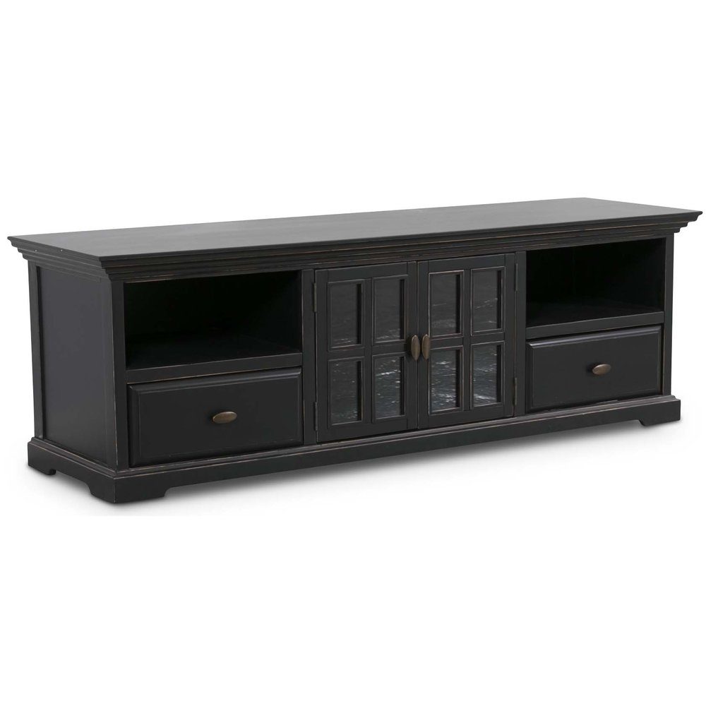 Stilig mediabänk i lackad poppel/mdf med två lådor, två fack och två glasdörrar. Stilen på hela möbelserien Paris, går i antik vintage med medvetna slitningar i lacken för det rätta antika utseendet.