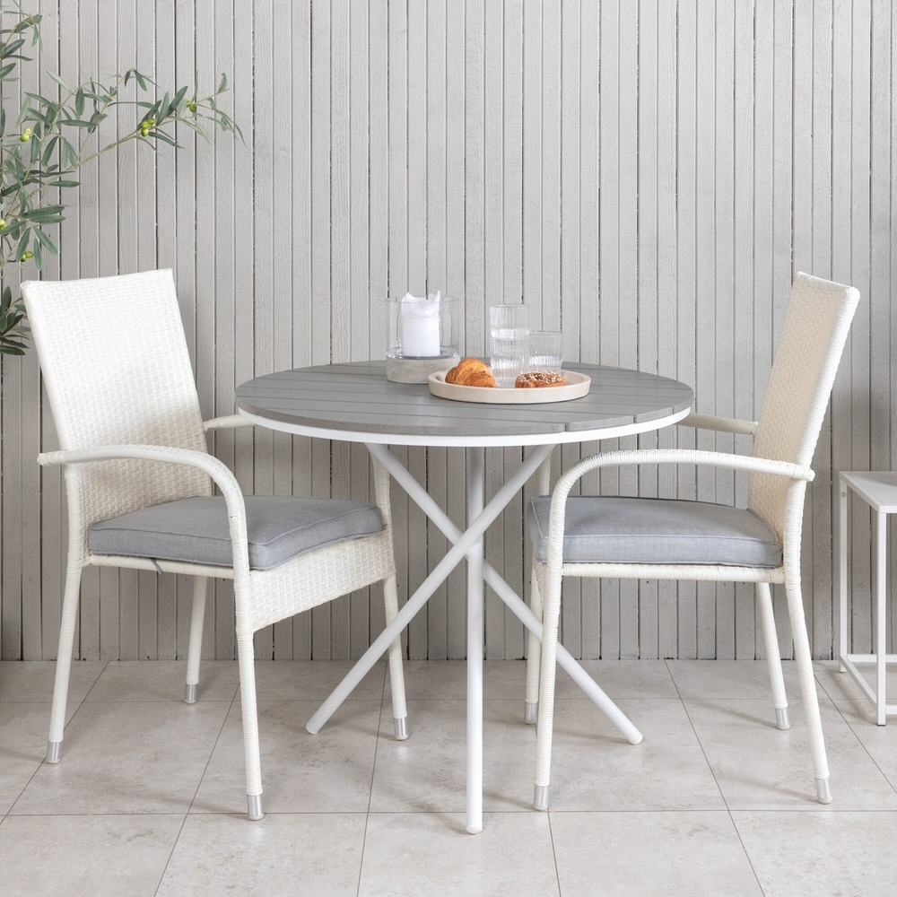 Liten och nätt matgrupp som passar perfekt på balkogen. Cafébord Parma tillsammans med våra stapelbara grå konsrottingstolar Anna. Möblera och gör dig redo för utesäsongen - på bästa sätt!