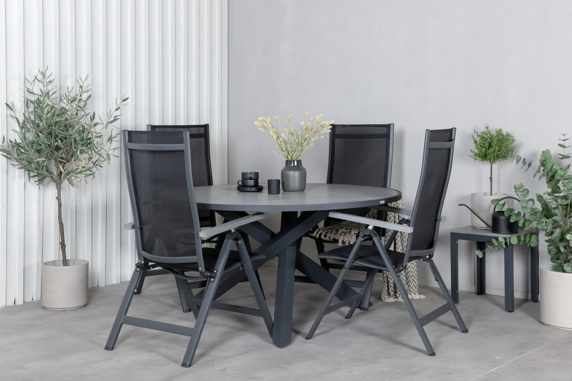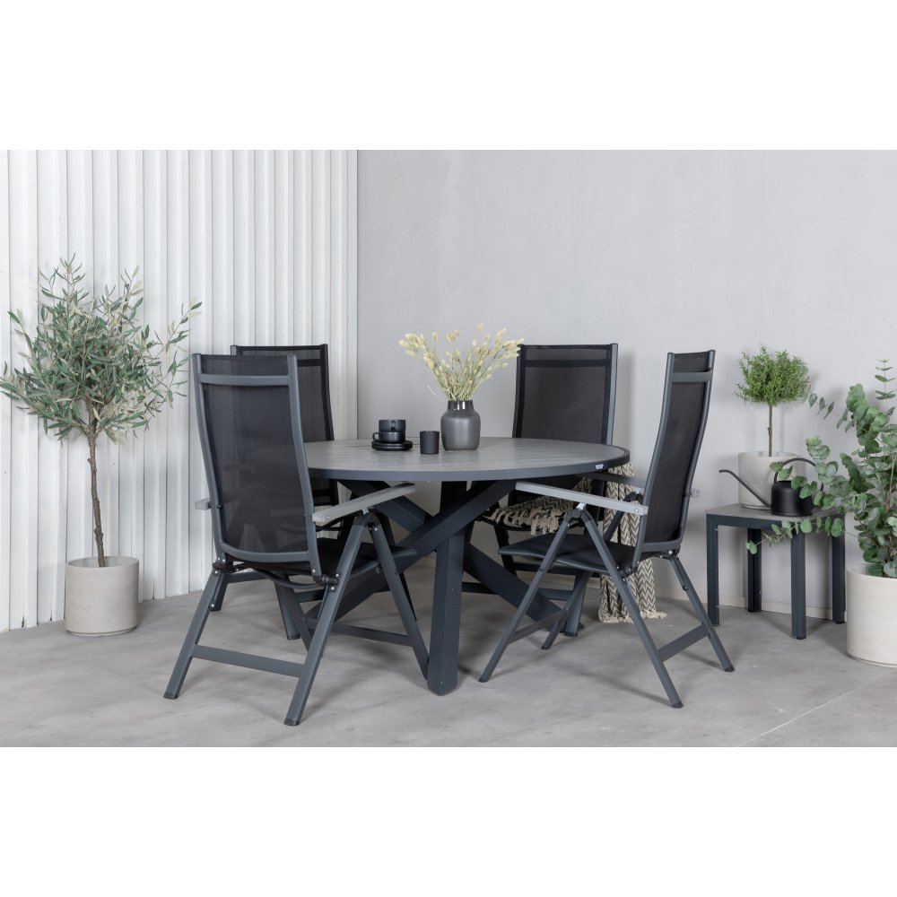 En rund matgrupp i svart kulör är alltid ett stilfullt val. Matbord Parma med sin robusta krysstomme och grå bordsskiva passar perfekt tillsammans med matstolarna Albany. Stolarna är fällbara och ger god sittkomfort – justera ryggstödet för att njuta av långa sommarmiddagar i goda vänners sällskap.
