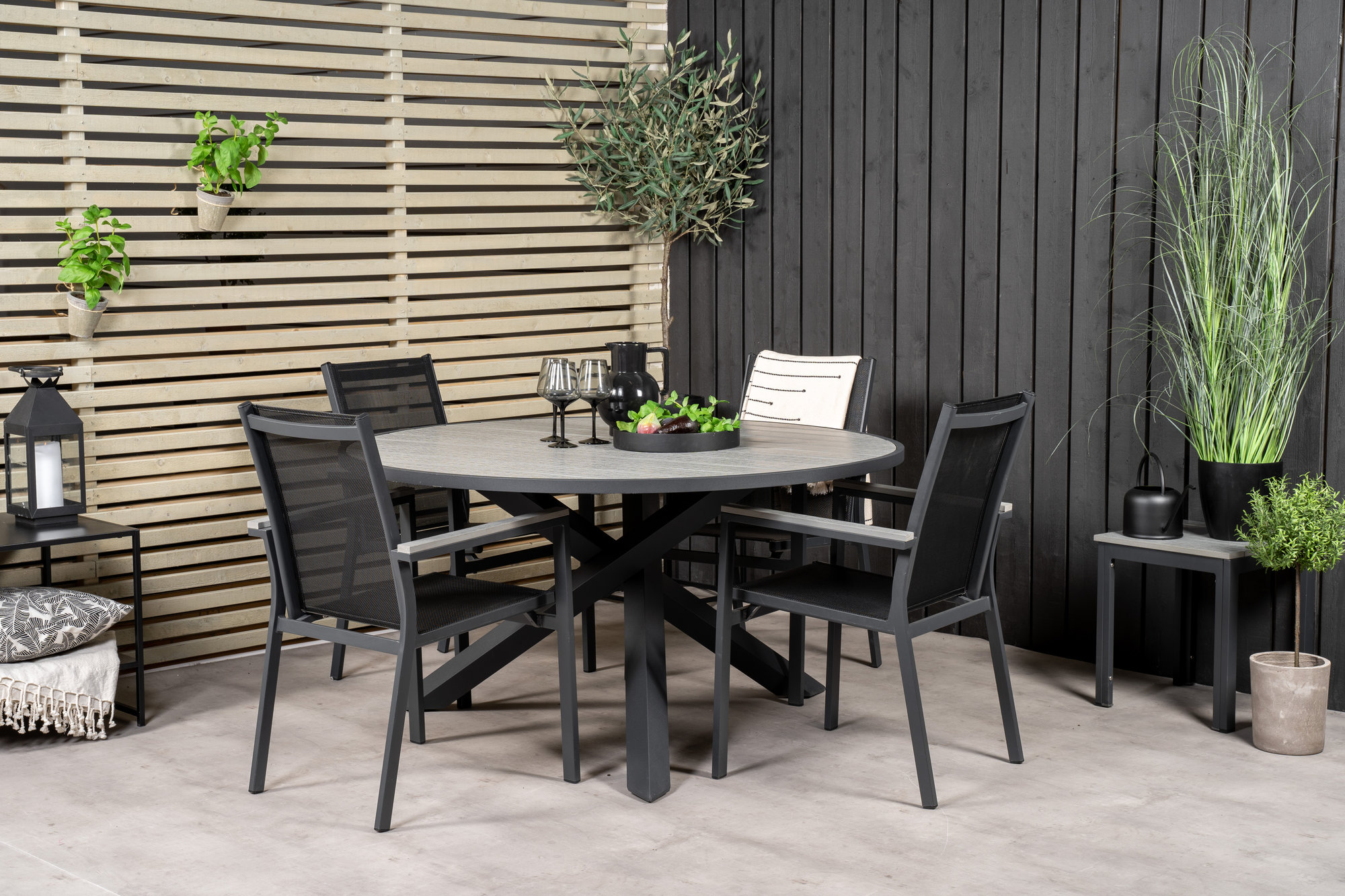 En rund matgrupp skapar en inbjudande atmosfär på uteplatsen eller altanen. Här kombineras matbord Parma med stilrena och bekväma stolar från samma serie.
