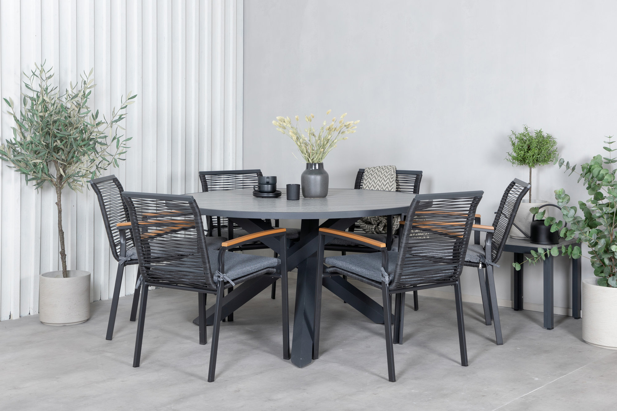 Snyggt, modernt och slitstarkt – vad mer kan man önska? Skapa en social atmosfär på uteplatsen med det runda matbordet Parma. Här i kombination med våra läckra matstolar från serien Dallas. Stolarna är väl tilltagna i svart rep och har dekorativa armstöd i trä.
