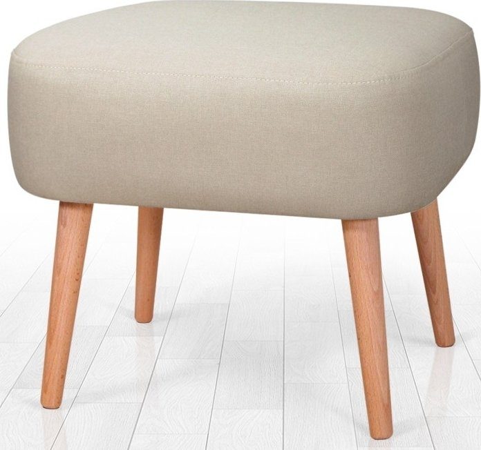 Sittpuff av trä. Klädd med bomull och linne. Stoppning av skum.