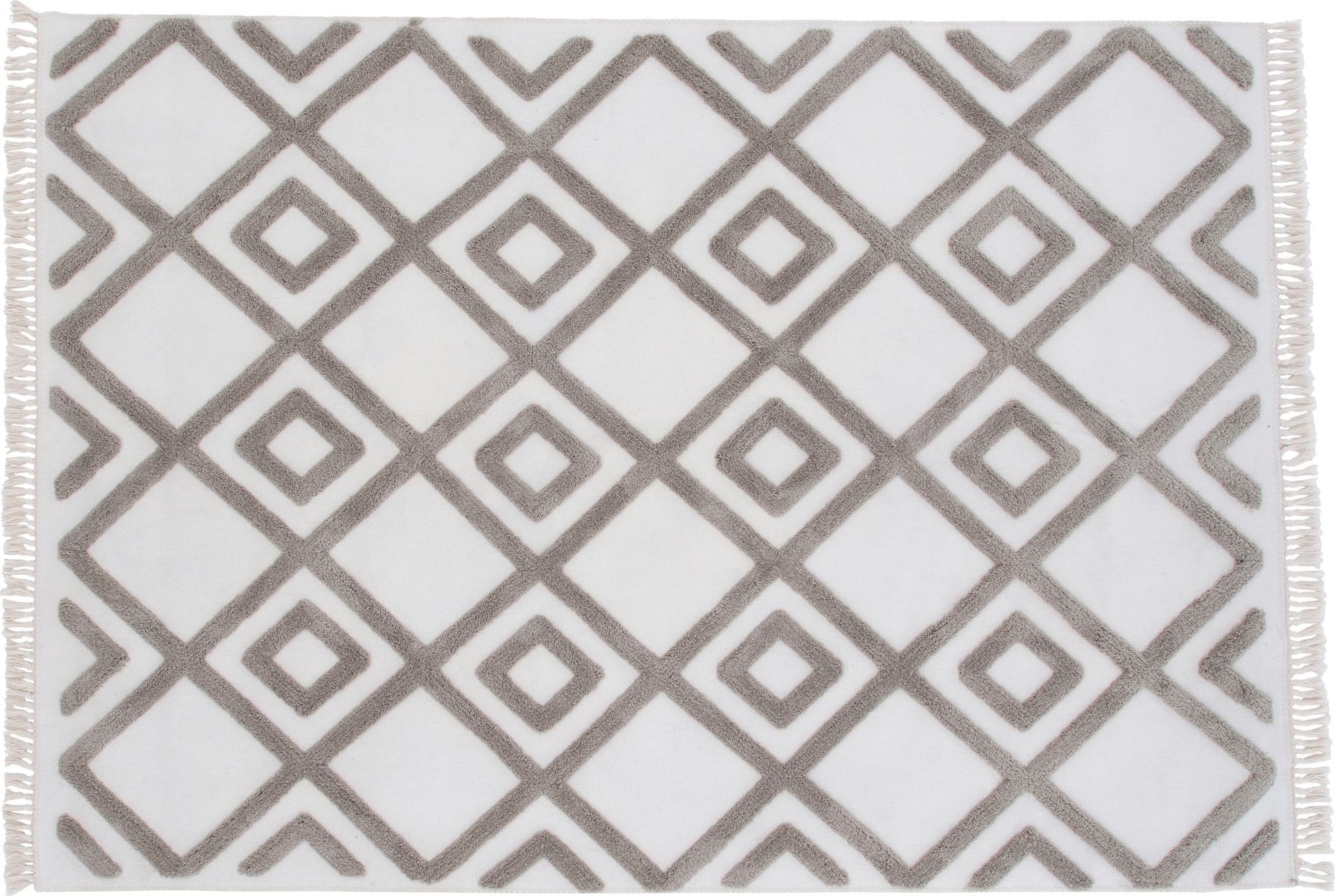 Handvävd polyestermattan matta i dekorativ design med färgbas i vitt. Mattan har ett upphöjt mönster i nougatfärgad nyans och dekorativa fransar.