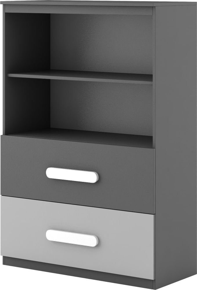 En snygg bokhylla med en modern design. Tillverkad i MDF med goda förvaringsmöjligheter i form av två breda hyllplan och två förvaringslådor.