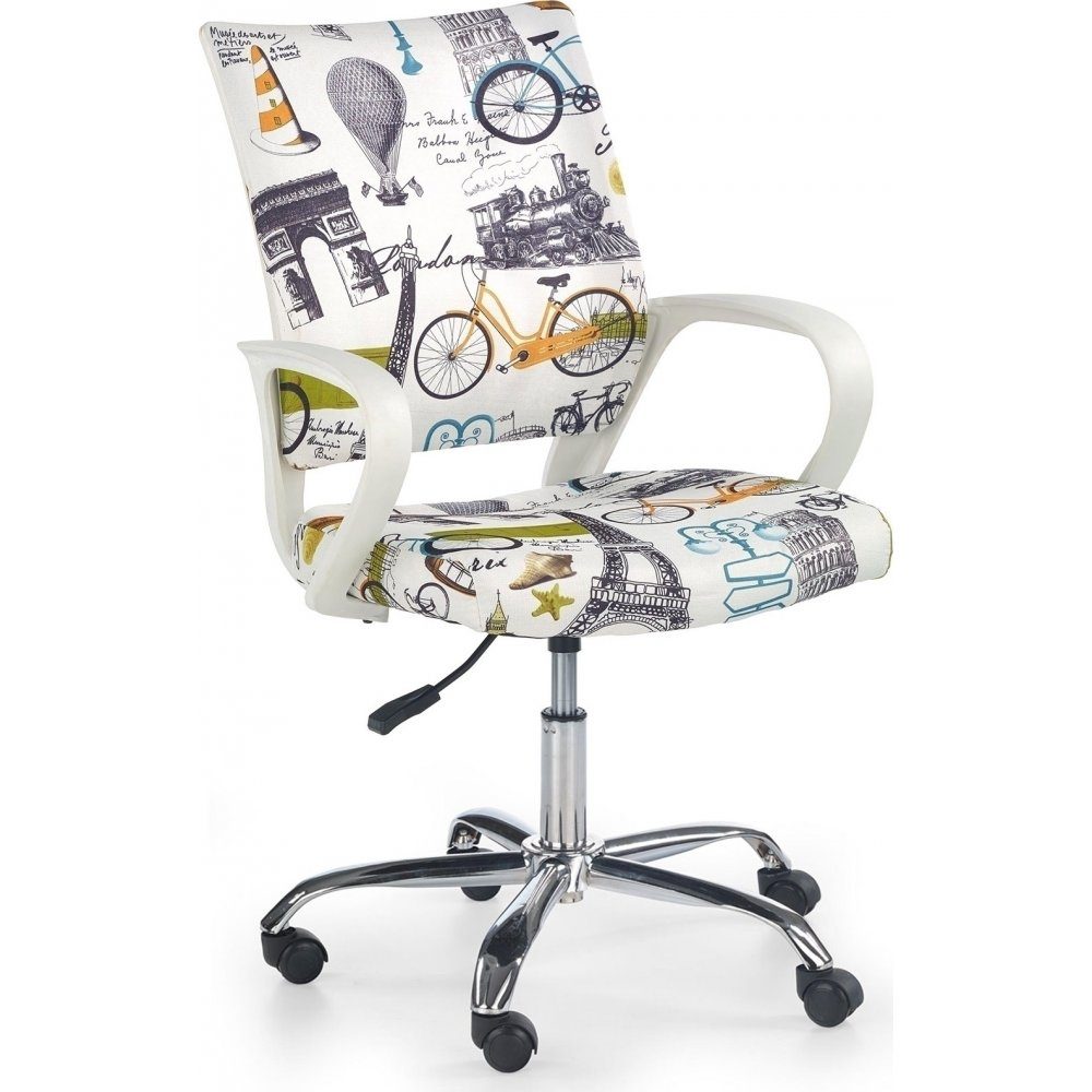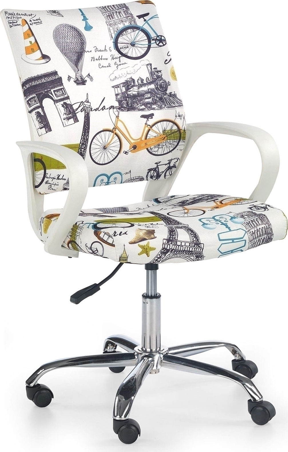 En stilig kontorsstol med en härlig design. Tillverkad i metall med detaljer i plast och en mycket härlig klädsel i vitt konstläder & tyg med motiv. Sitsen är höj-och sänkbar samt lätt att förflytta med hjälp av hjulen under stjärnfoten.