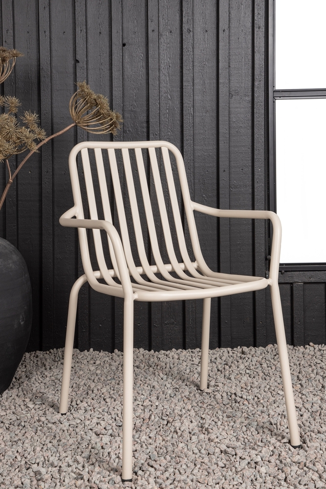 Matstolen från serien Peking skapar snabbt ett modernt blickfång på din uteplats! Det ribbade utförandet och smickrande beige kulören gör att stolen både känns modern och tidlös. Tillverkad i aluminium som gör den enkel att flytta runt och integrerade armstöd för extra komfort. Sitt kvar länge och njut av trivsamma måltider! Stolen är stapelbar.