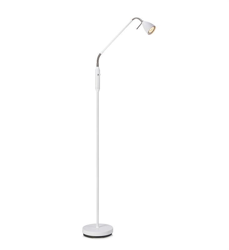 Persson golvlampa med en stilren design. Tillverkad i vit metall med inbyggd dimmer/strömbrytare och ställbart lamphuvud med dubbla flexarmar. GU10 lamphållare för max 35W halogen eller motsvarande styrka i LED eller lågenergi. 2 meter sladd. Lampan är lättplacerad och passar perfekt in på flera olika platser i hushållet.