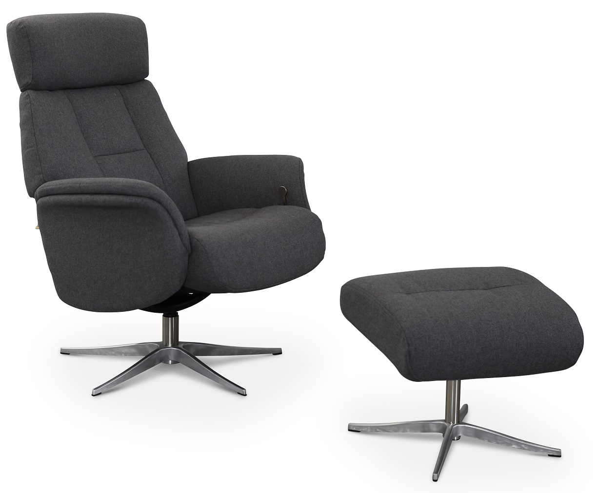 Bekväm snurrfåtölj med justerbart ryggstöd och fotpall. Modern och trevlig design. Stolen är klädd i ett slitstarkt grått tyg.