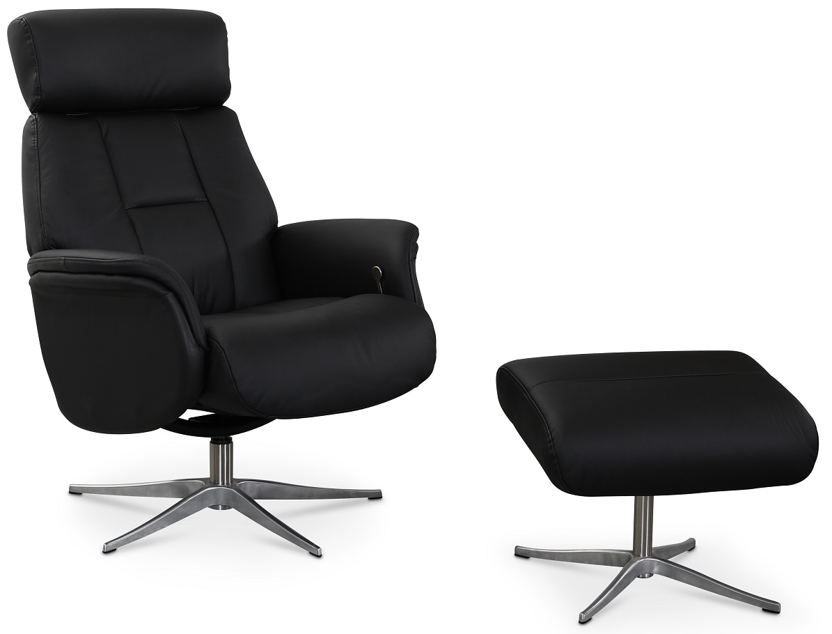 Bekväm snurrfåtölj med justerbart ryggstöd och fotpall. Modern och trevlig design. Stolen är klädd i svart äkta läder med svart PVC på utsidan av stolen.