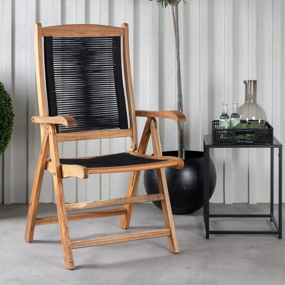 Att matcha svart och trä känns bara helt rätt! Stolen blir garanterat ett blickfång på altanen tack vare sin moderiktiga konstruktion i acacia och sits i slitstarkt svart rep. En fällbar matstol som garanterat ger uteplatsen ett pampigt uttryck. Skötselråd: Våra rep är kvalitetsspunna polyesterrep som är lätta att rengöra. Möblerna är behandlade för att klara 500-2000 timmar. Vi rekommenderar såpa och vatten för rengöring. Låt lufttorka. För de områdena som är svårare att komma åt kan en liten borste användas försiktigt. Använd aldrig högtryckstvätt eller starka kemikalier för att rengöra repet.