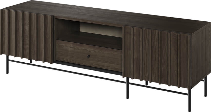 Mediabänk av laminerad spånskiva med ben av metall. Levereras omonterad.