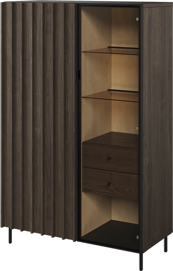 Vitrinskåp av laminerad spånskiva med LED-belysning, glasdörr och ben av metall. Levereras omonterad.