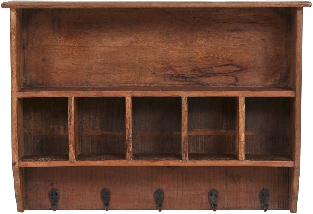 Hylla i rustik-stil med små fack, hyllplan och krokar. Här kan mindre prylar förvaras, kombinerat med krokar för att hänga upp handdukar, förkläde eller annat.