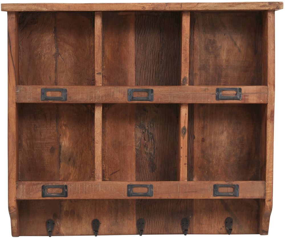 Hylla i rustik-stil med små fack, hyllplan och krokar. Här kan mindre prylar förvaras, kombinerat med krokar för att hänga upp handdukar, förkläde eller annat.
