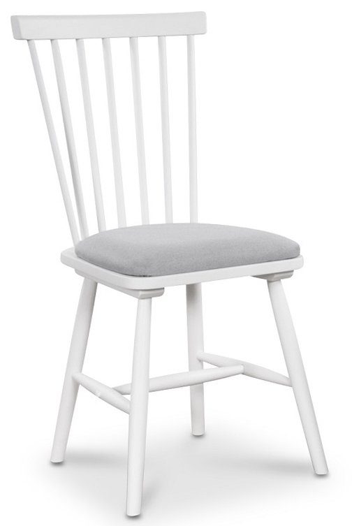 Pinnstolen är mer populär än någonsin och med stolen Småland kan vi erbjuda ett mycket prisvärt alternativ. Finns i fler färger. Sitsen har en stoppad tygsits för att ge en skön och behaglig sittkomfort! Stolen är vitlackad med ljusgrått slitstarkt tyg!