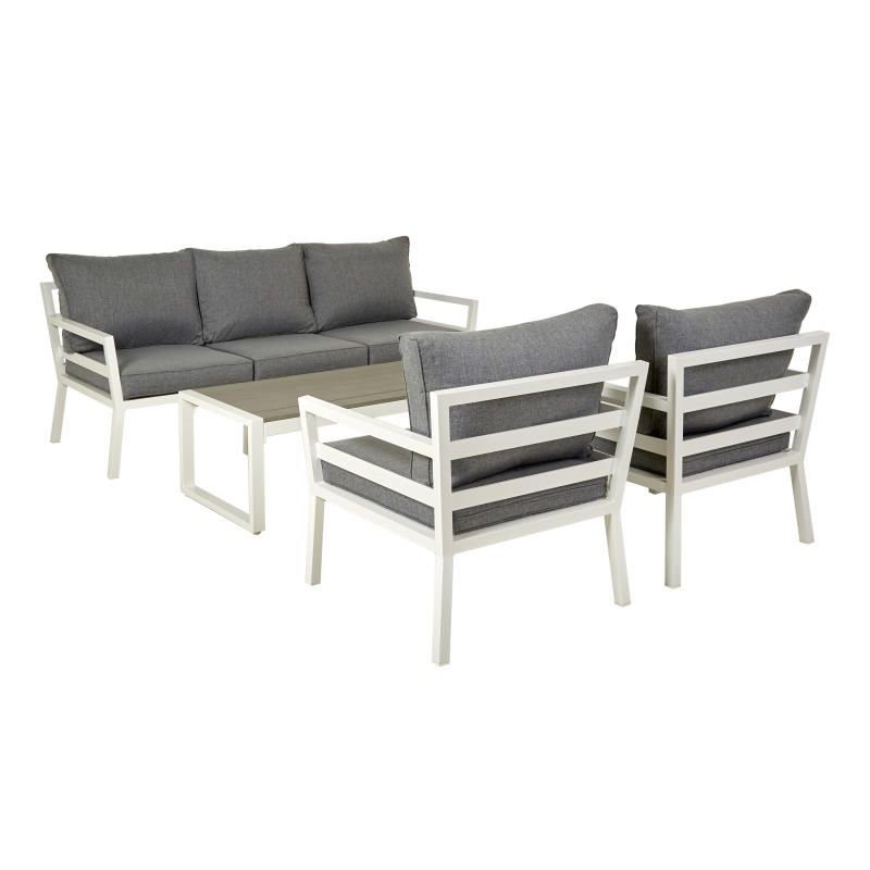 En härlig soffgrupp med en stilren design. Tillverkat i vit aluminium och bordet har en toppskiva av konstträ. Gruppen passar perfekt till uteplatsen och kan vara det lilla extra som behövs för att maxa mysfaktorn.