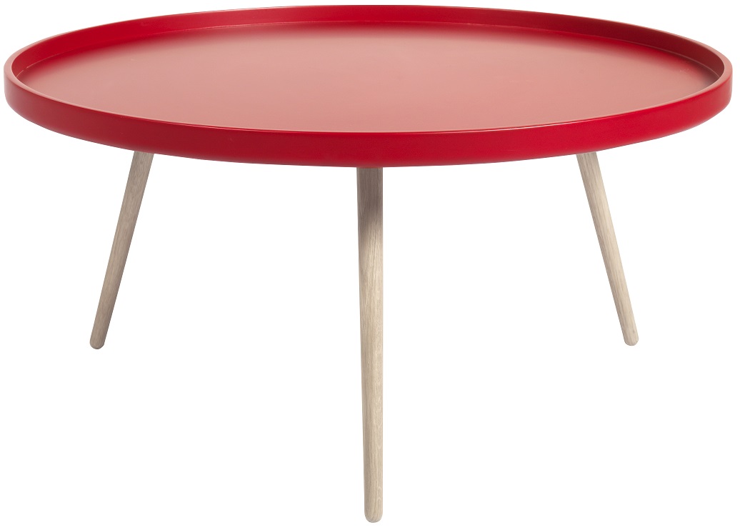 Stilrent och nätt runt soffbord med toppskiva i rödlackerad MDF och tisdenliga runda ben i whitewash ek.