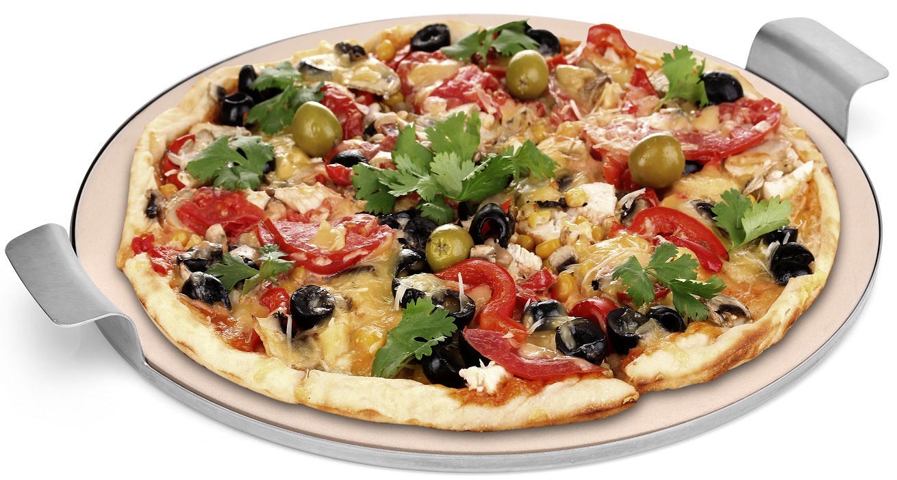 Rund pizzasten för att grädda pizzor på med serveringsstativ i stål.