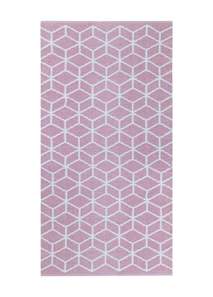 Britton plastmatta har ett rosa-vitt mönster med svetsade kanter på ändarna. Mattan har inverterade färger där färgerna blir omvända om man vänder på den.