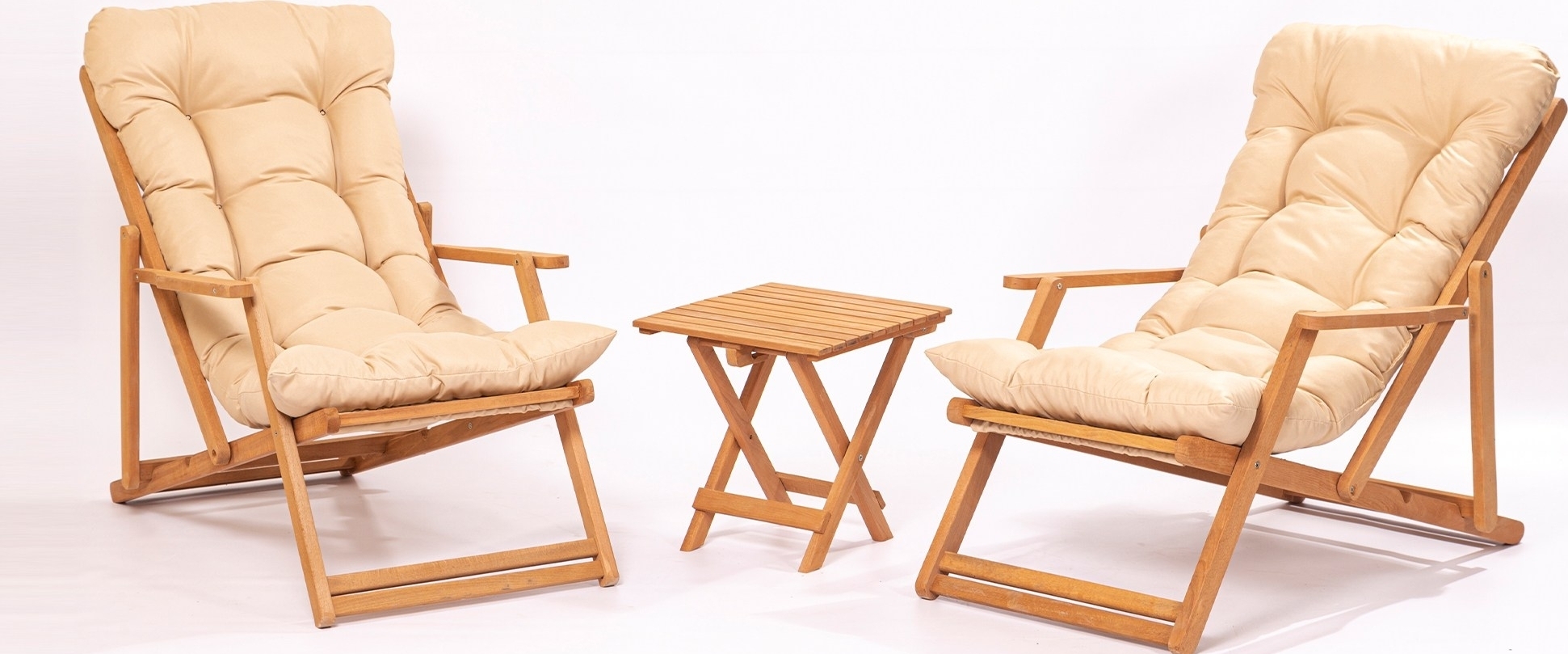 Loungegrupp av bokträ med 2 st stolar och ett bord.