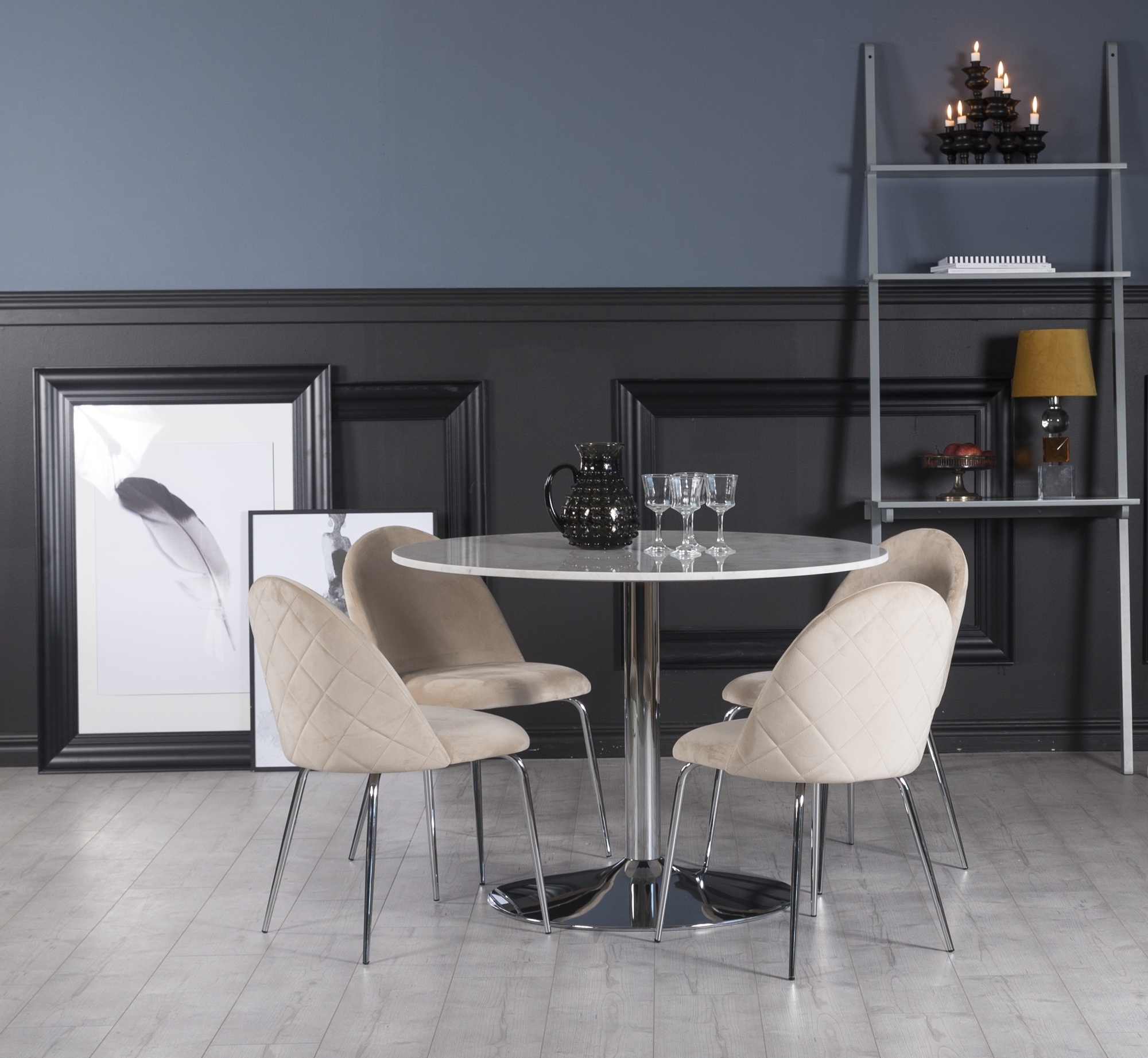 Plaza matgrupp, marmorbord med 4 st Plaza sammetsstolar - Beige/Vit/Krom