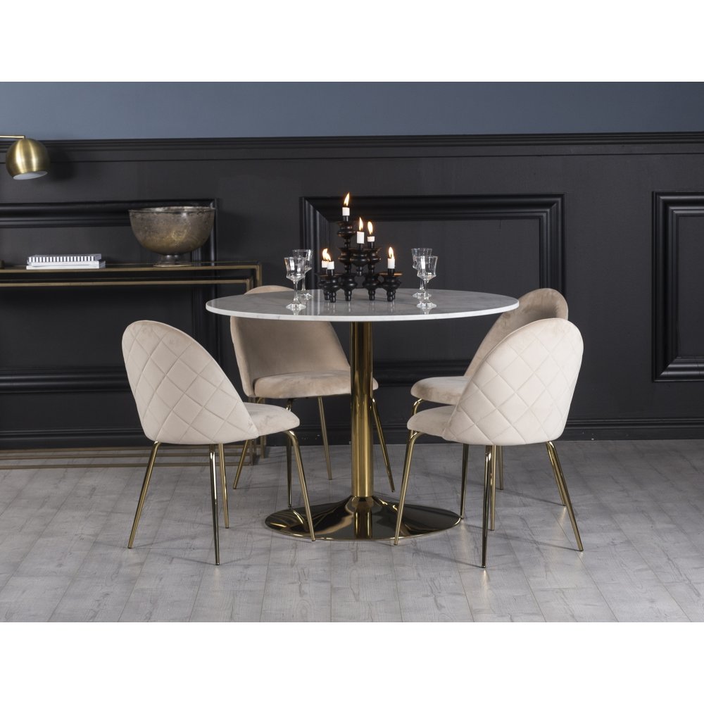 Plaza matgrupp, marmorbord med 4 st Plaza sammetsstolar - Beige/Vit/Mässing