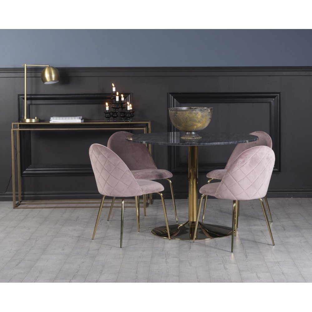 Plaza matgrupp, marmorbord med 4 st Plaza sammetsstolar - Rosa/Grå/Mässing