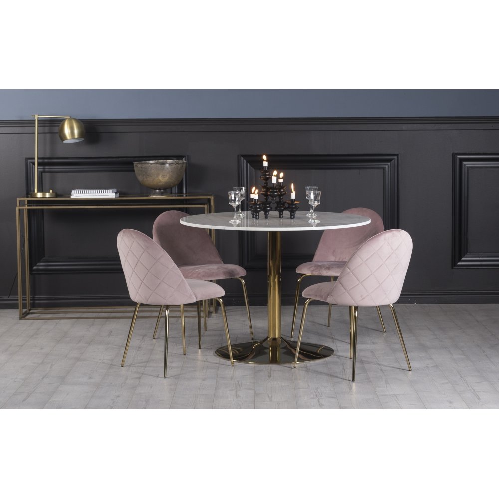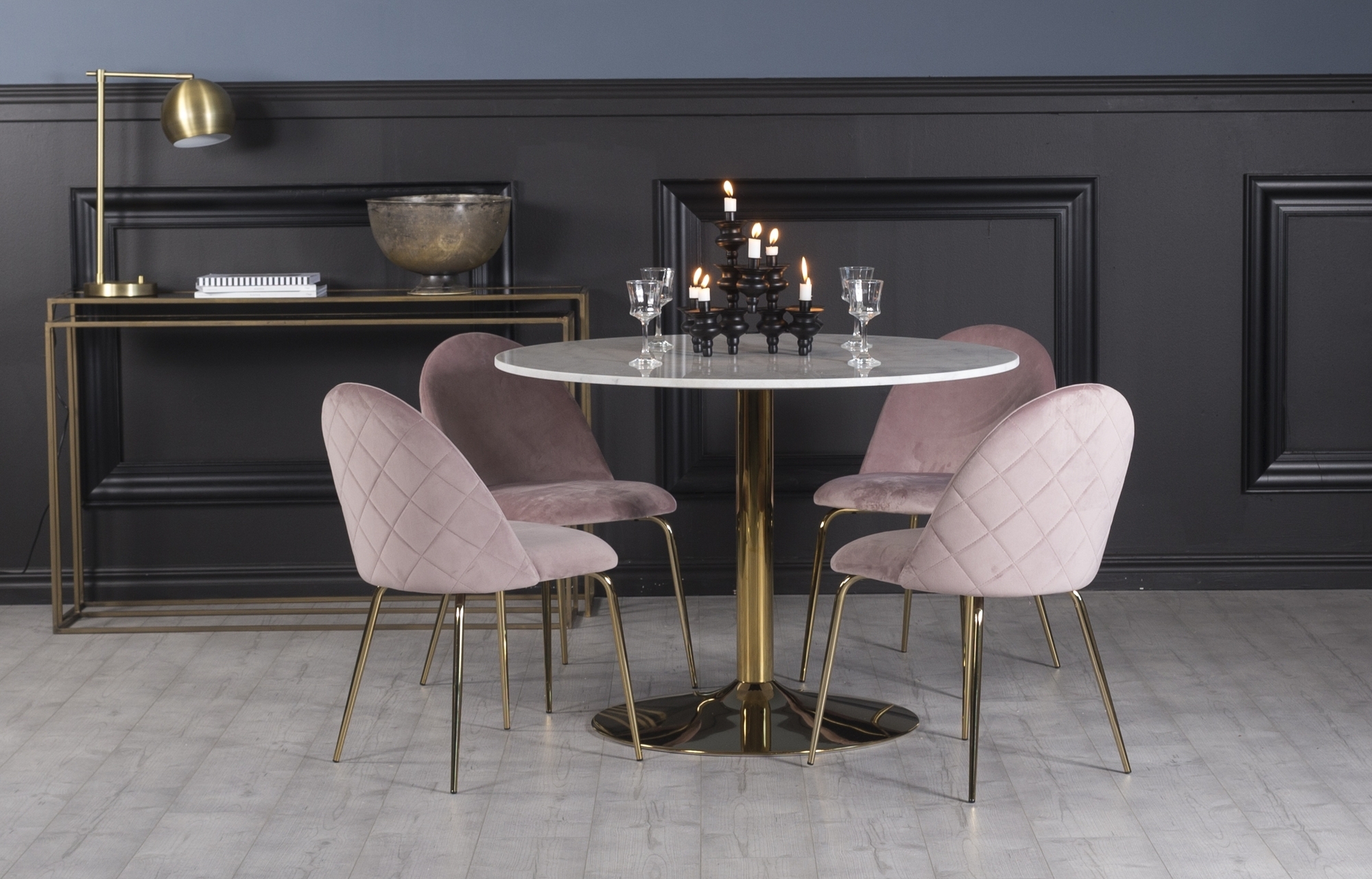 Plaza matgrupp, marmorbord med 4 st Plaza sammetsstolar - Rosa/Vit/Mässing