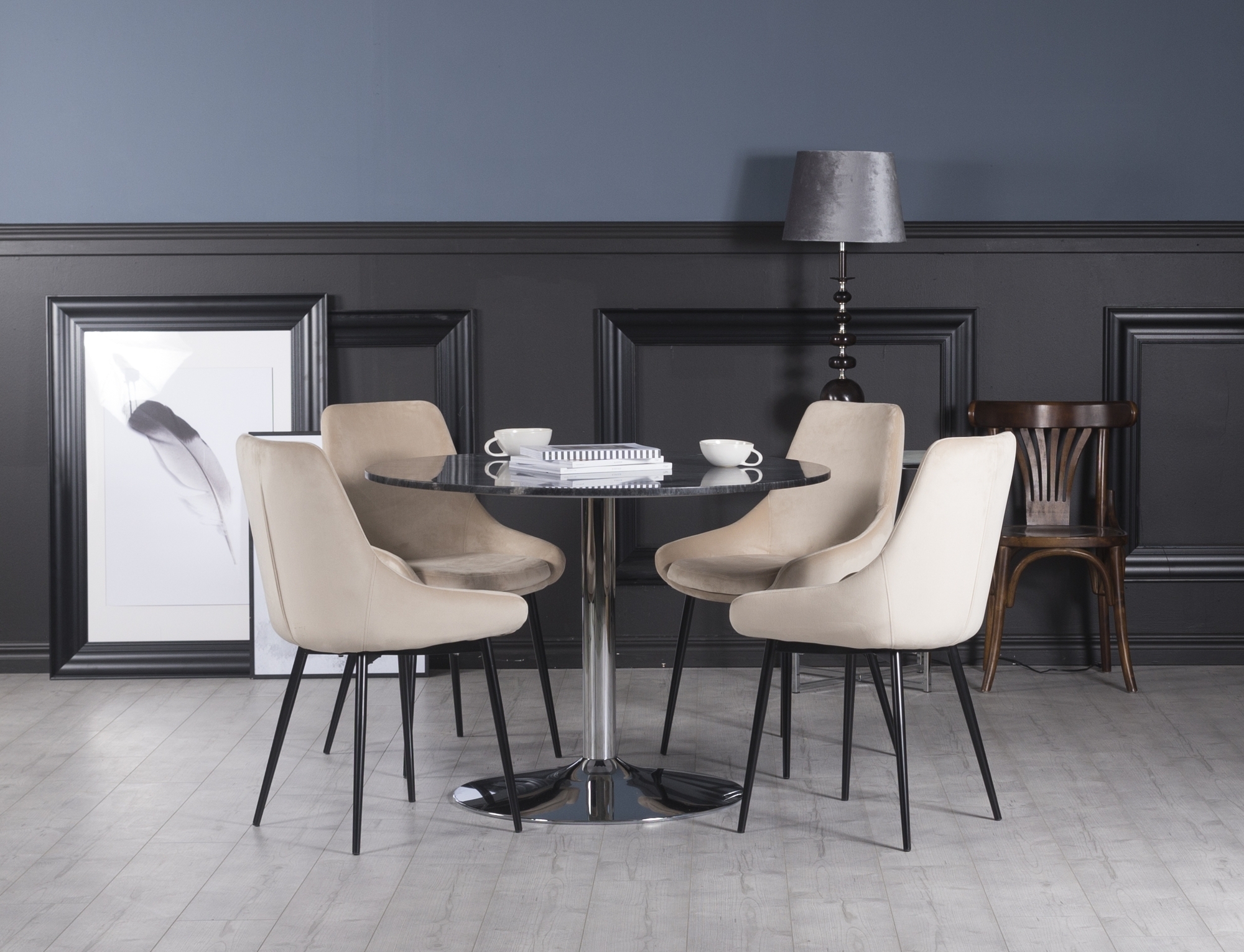 Matgrupp från Skånska Möbelhuset, Plaza marmorbord med grå äkta marmorskiva på kromad trumpetfot. Medföljer 4 st matchande Theo sammetstolar i beige sammet med svarta metallben.