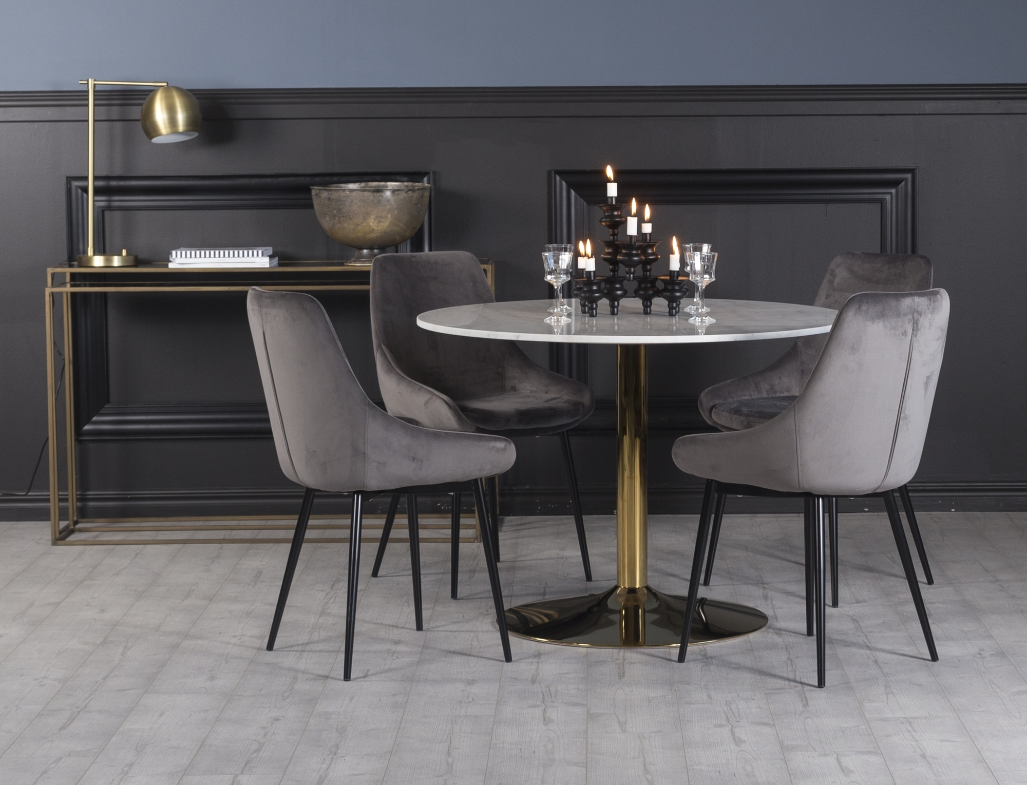 Matgrupp från Skånska Möbelhuset, Plaza marmorbord med vit äkta marmorskiva på trumpetfot i mässing. Medföljer 4 st matchande Theo sammetstolar i grått sammet med svarta metallben.
