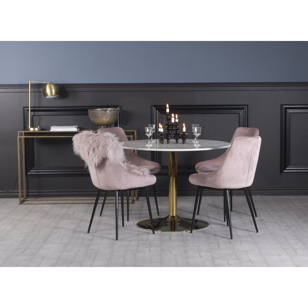 Plaza matgrupp, marmorbord med 4 st Theo sammetsstolar - Rosa/Vit/Mässing