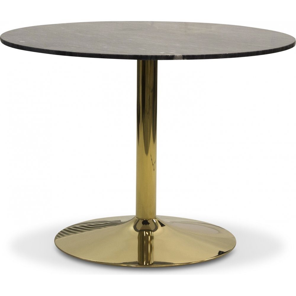 Ett runt matbord i stilren och modern design med toppskiva i äkta grå marmorsten. Trumpetfot i blank mässing.