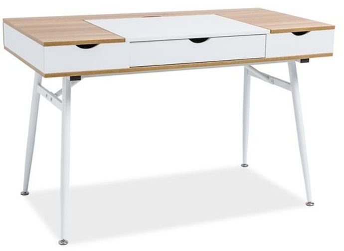 Ett mysigt skrivbord med en klassisk design. Underredet är tillverkat av vitlackerad metall och bordet är av MDF med vitt och ek utförande med tre praktiska lådor för smart förvaring.