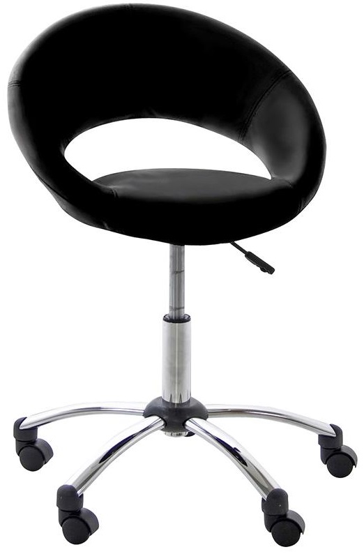 Modern skrivbordsstol från vår Plump serie. Sitsen är klädd med svart konstläder (PU) och den 5-stjärninga foten är kromad metall med hjul och reglage för höjdreglering av sitsen.