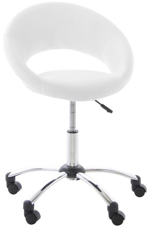 Modern skrivbordsstol från vår Plump serie. Sitsen är klädd med vitt konstläder (PU) och den 5-stjärninga foten är kromad metall med hjul och reglage för reglering av höjden på sitsen.