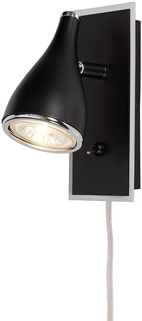 En snygg vägglampa med en stilren design. Tillverkad i svart metall med detaljer i krom. Strömbrytare på basen.