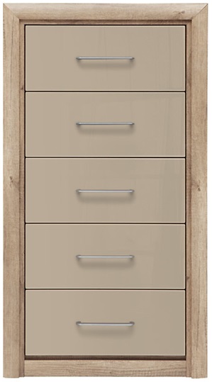 En byrå i ek med fem lådor. Med fronter i beige och metallhandtag blir byrån mycket stilren. Eftersom byrån är smal är den lättplacerad även i mindre utrymme.