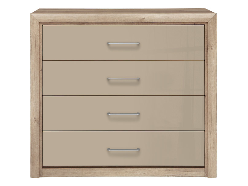 En fin byrå i ek med fyra lådor. Lådorna har beige fronter med metallhandtag vilket ger ett mycket stilrent intryck. Byrån är mycket lättplacerad och passar lika bra i vardagsrummet som i sovrummet.