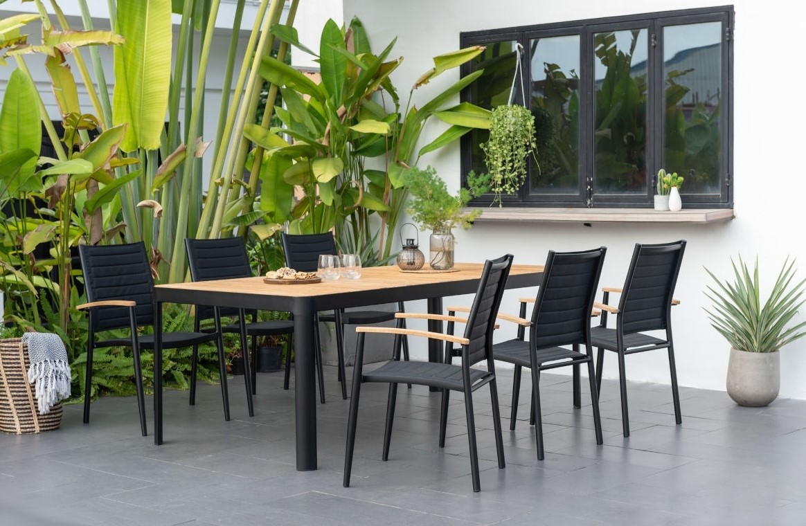 Matgrupp med 1 st matbord (209x105 cm) och 6 st staplingsbara matstolar.