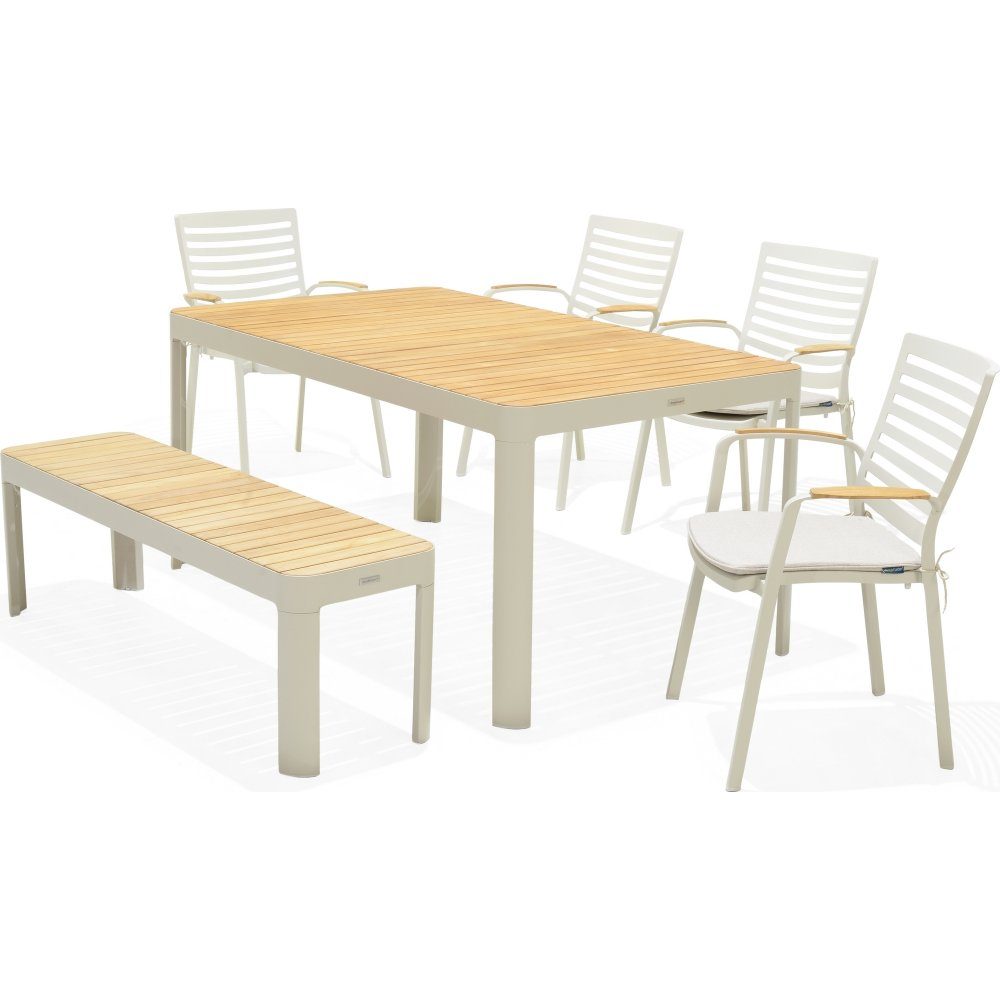 Matgrupp med 1 st matbord (161x95 cm), 1 st sittbänk och 4 st staplingsbara matstolar.