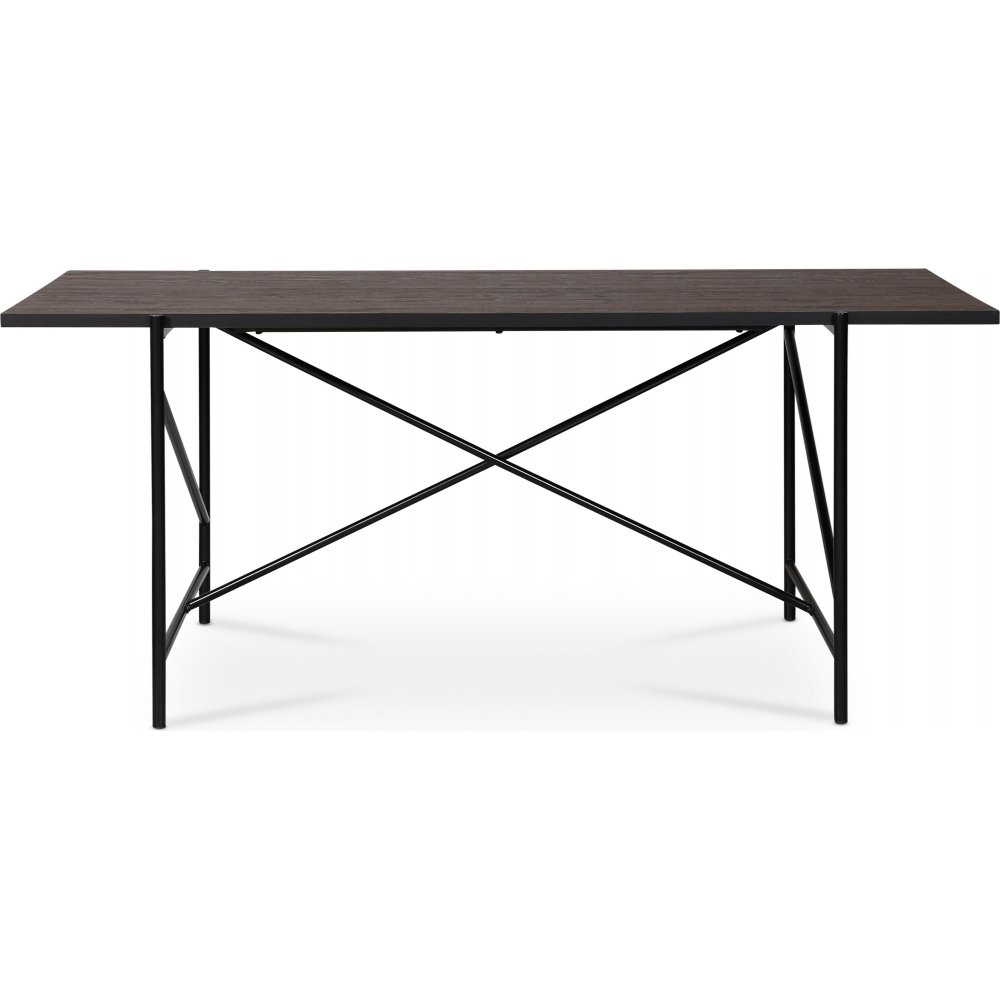 Matbord med toppskiva av MDF med mönster av mörkbrun betsad ek. Svartlackat underrede av metall.